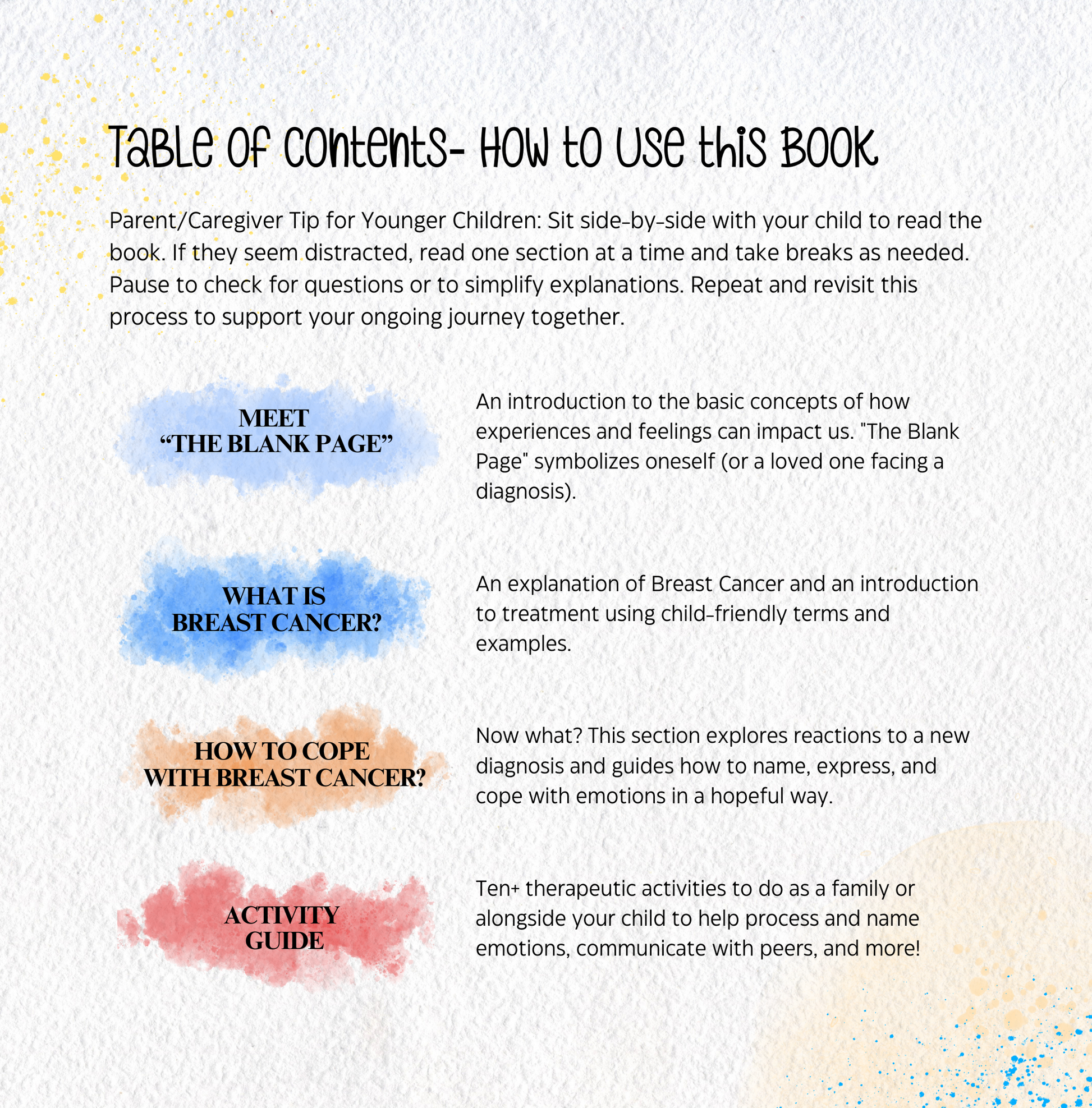 This book, along with the concluding activity guide which includes 10+ therapeutic activities to further coping, helps children learn about Breast Cancer in a child-friendly manner, fostering a greater sense of empowerment and courage.